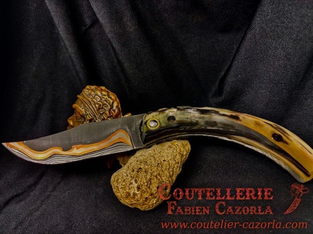 Un couteau corse pliant de fabrication traditionnelle avec une Lame de Damas Cuivre Nickel, épaisseur de 4 mm avec un manche réalisé en Corne de Bélier .
