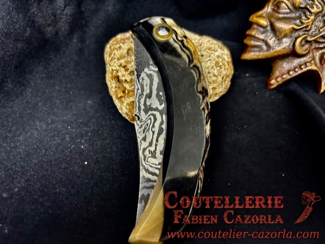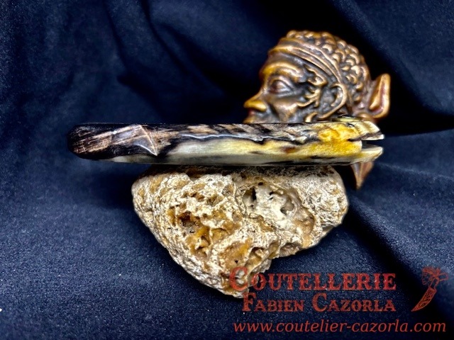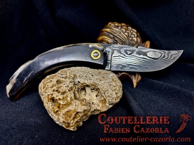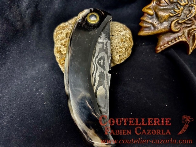 Un couteau corse pliant de fabrication traditionnelle  avec une Lame de Damas épaisseur de 3 mm avec un manche réalisé en corne de bélier .