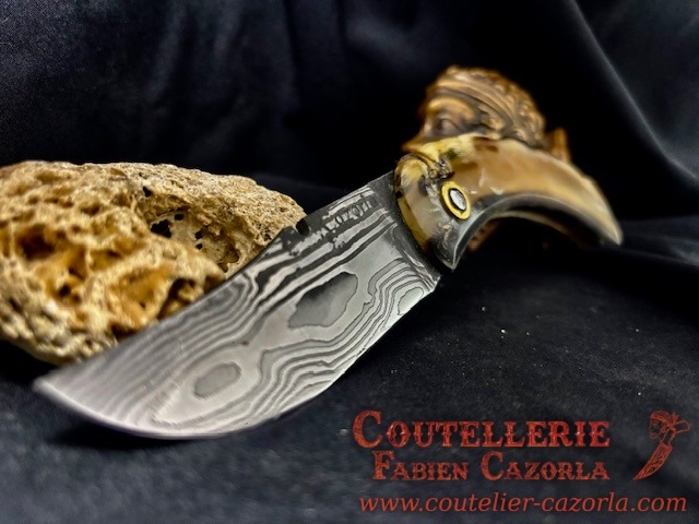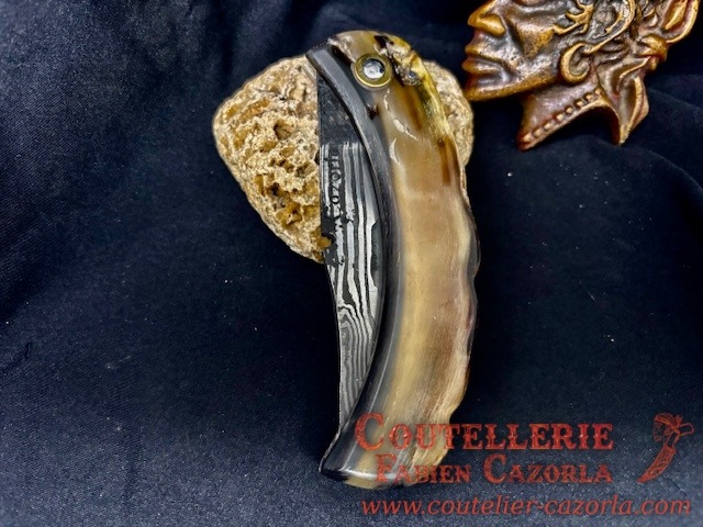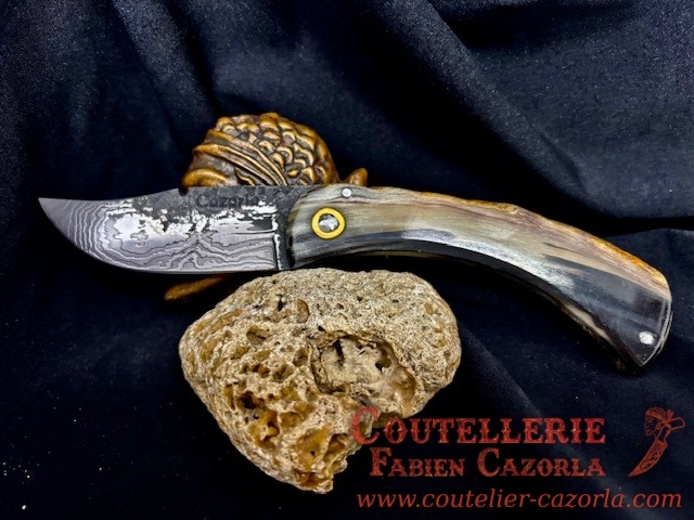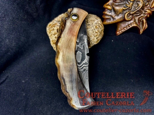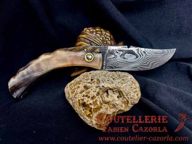 Un couteau corse pliant de fabrication traditionnelle  avec une Lame de Damas épaisseur de 3 mm avec un manche réalisé en corne de bélier .