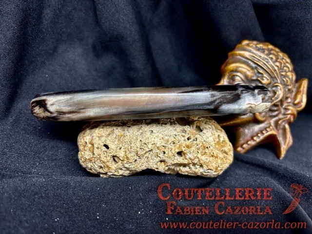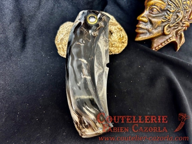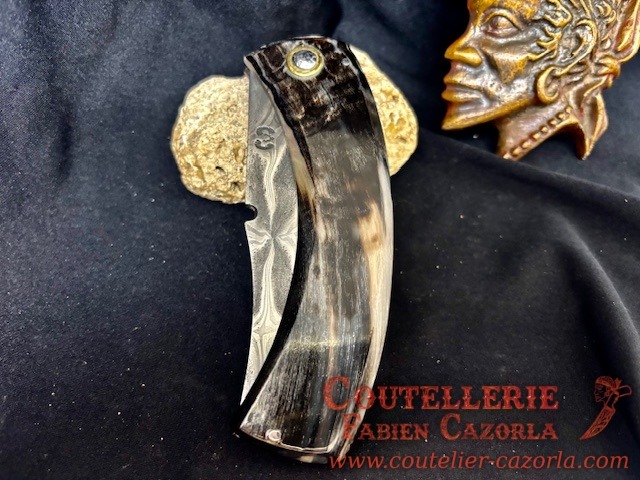 Un couteau corse pliant de fabrication traditionnelle  avec une Lame de Damas Constellation épaisseur de 4 mm avec un manche réalisé en corne de bélier .