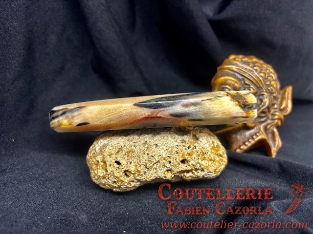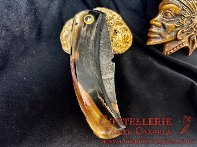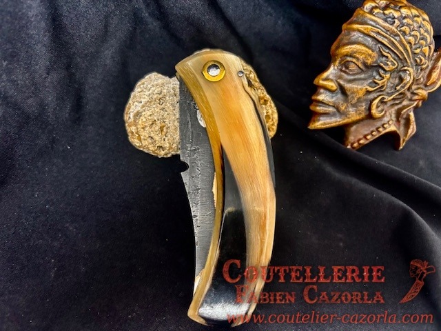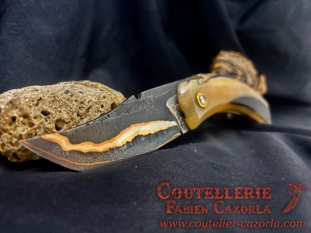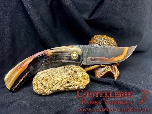 Un couteau corse pliant de fabrication traditionnelle avec une Lame de Damas Cuivre Nickel, épaisseur de 4 mm avec un manche réalisé en Corne de Bélier .
