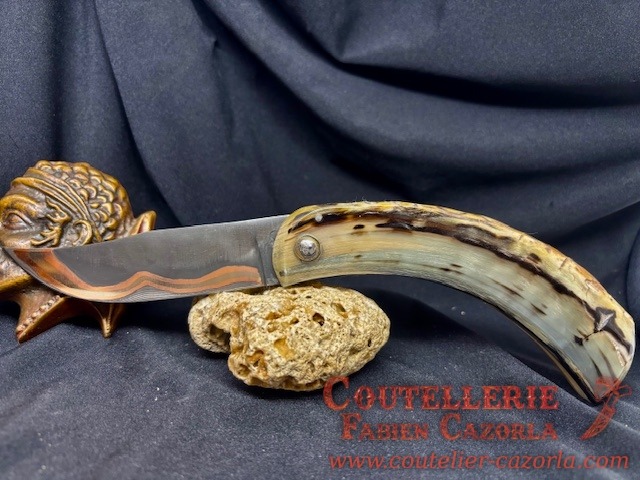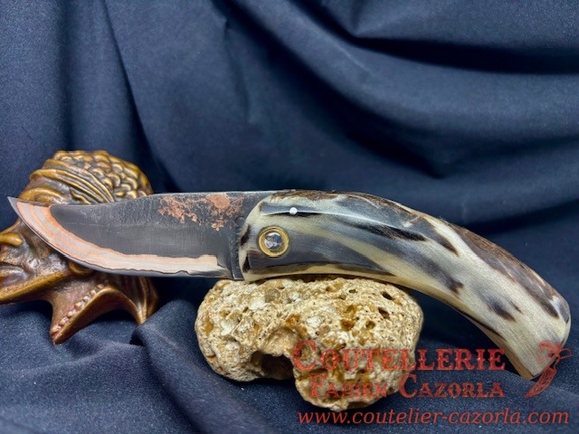 Un couteau corse pliant de fabrication traditionnelle avec une Lame de Damas Cuivre Nickel, épaisseur de 4 mm avec un manche réalisé en Corne de Bélier .