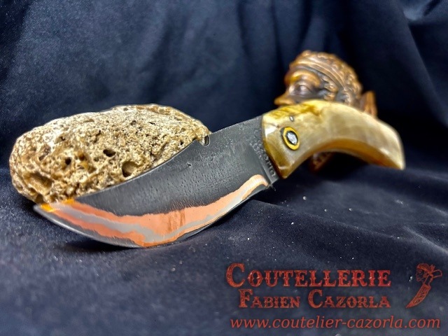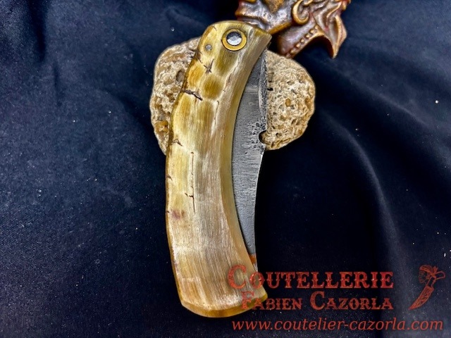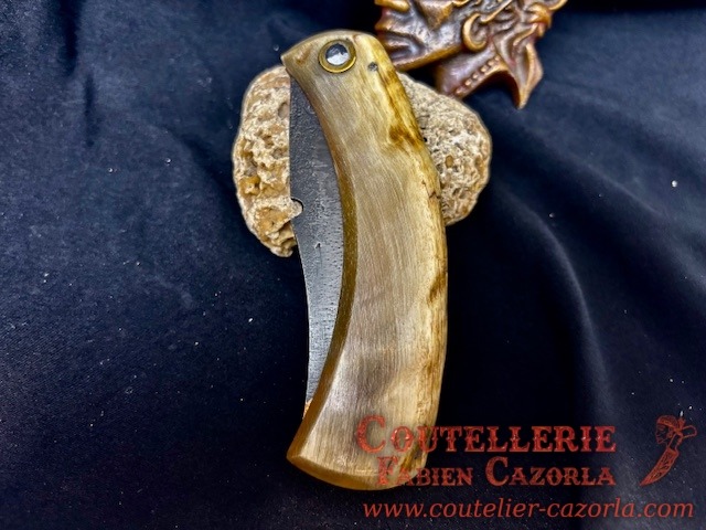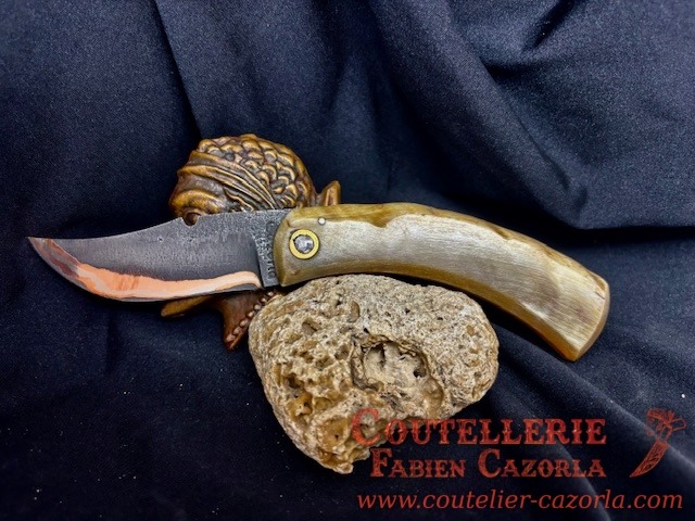 Un couteau corse pliant de fabrication traditionnelle avec une Lame de Damas Cuivre Nickel, épaisseur de 4 mm avec un manche réalisé en Corne de Bélier .
