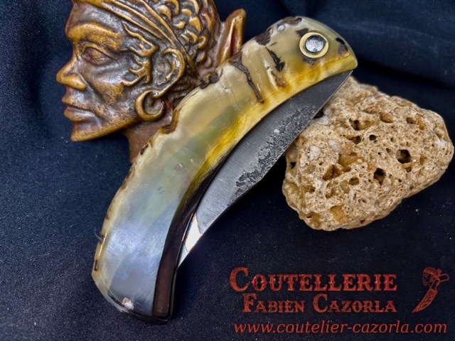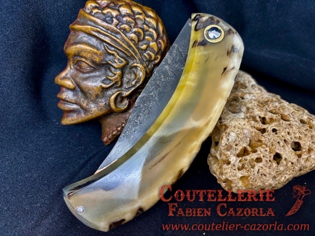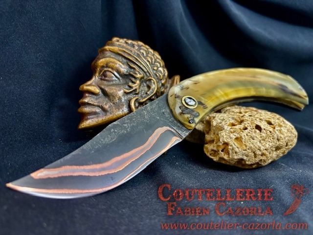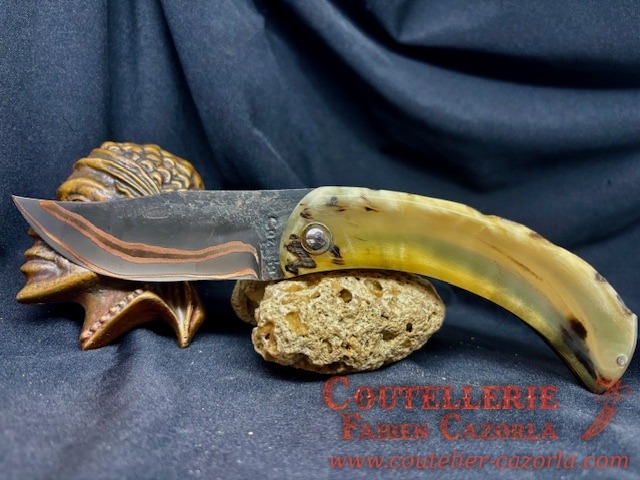 Un couteau corse pliant de fabrication traditionnelle avec une Lame de Damas Cuivre Nickel, épaisseur de 4 mm avec un manche réalisé en Corne de Bélier .