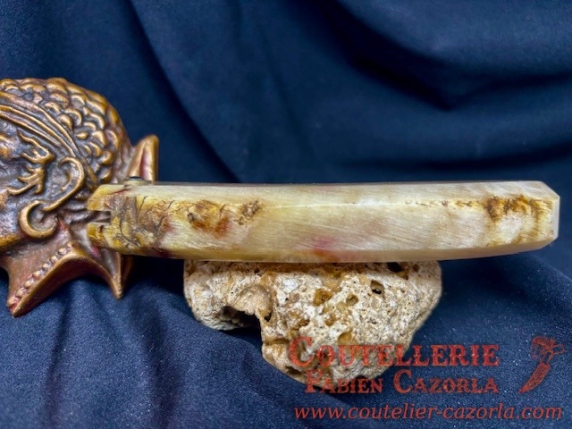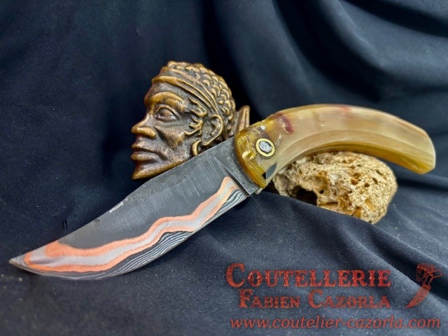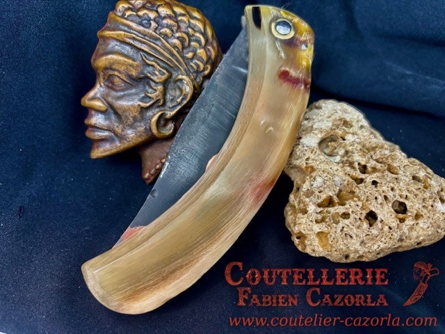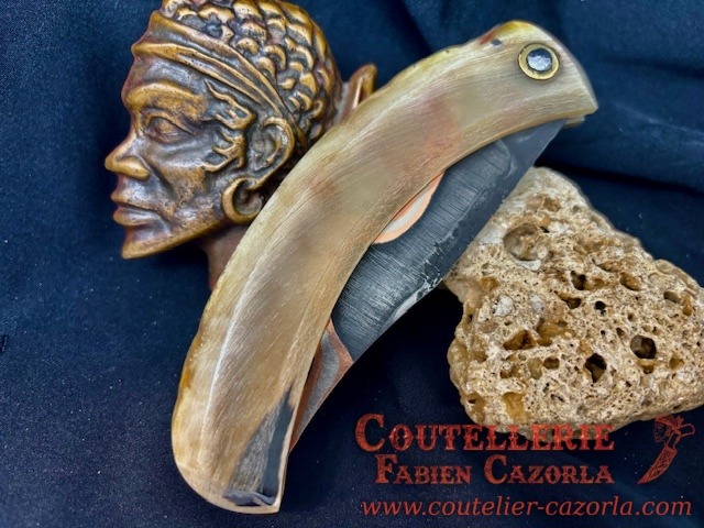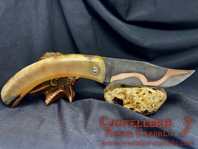 Un couteau corse pliant de fabrication traditionnelle avec une Lame de Damas Cuivre Nickel, épaisseur de 4 mm avec un manche réalisé en Corne de Bélier .