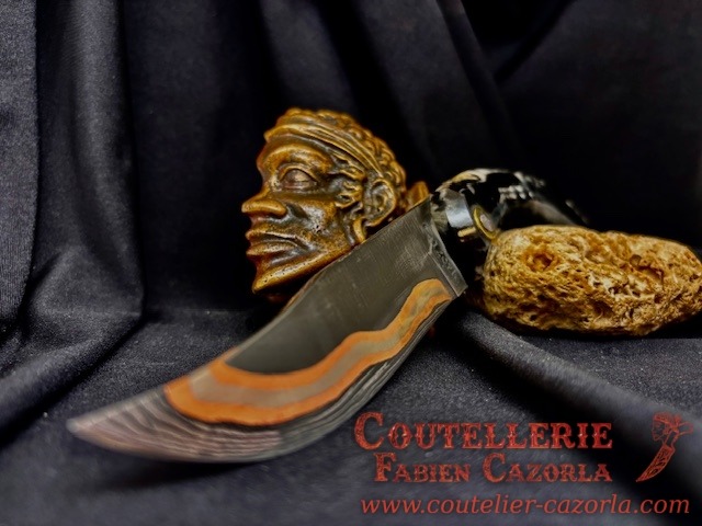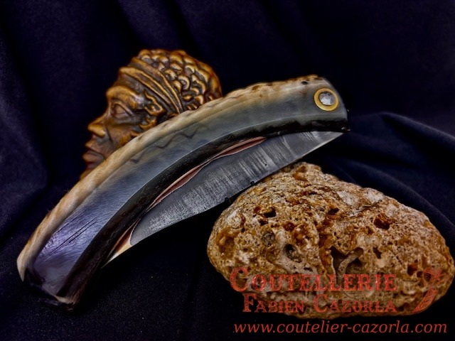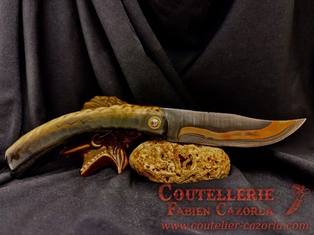 Un couteau corse pliant de fabrication traditionnelle avec une Lame de Damas Cuivre Nickel, épaisseur de 4 mm avec un manche réalisé en Corne de Bélier .