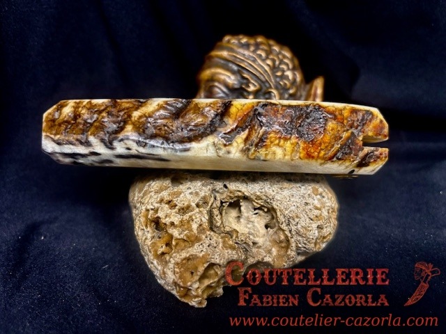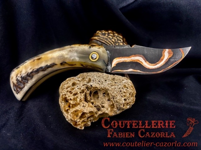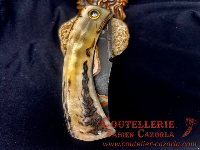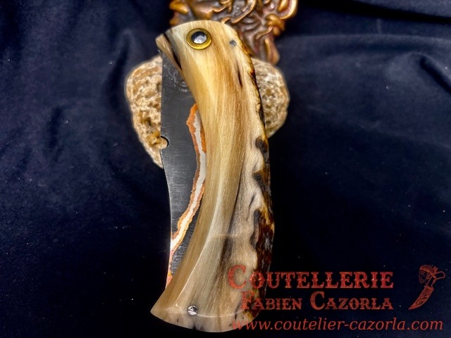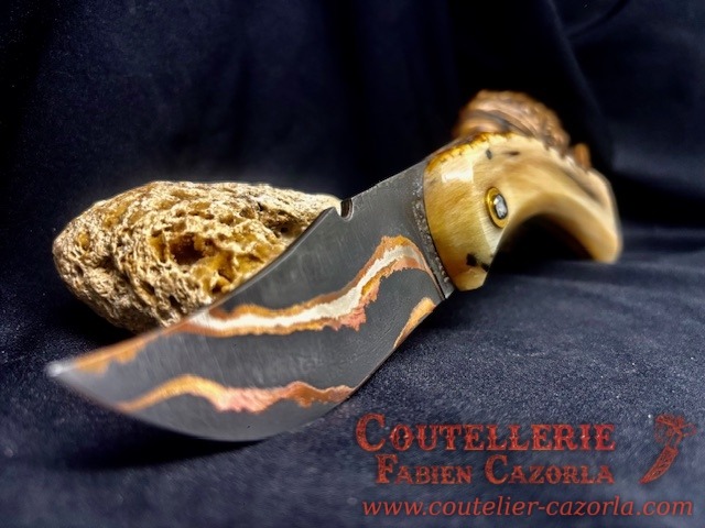 Un couteau corse pliant de fabrication traditionnelle avec une Lame de Damas Cuivre Nickel, épaisseur de 4 mm avec un manche réalisé en Corne de Bélier .