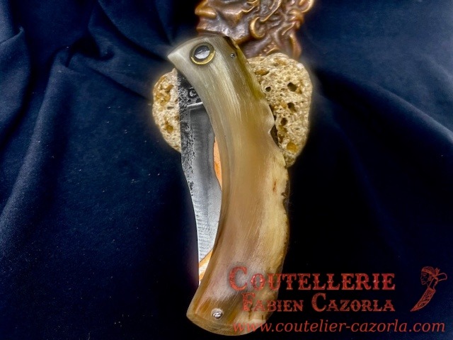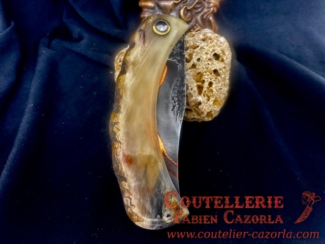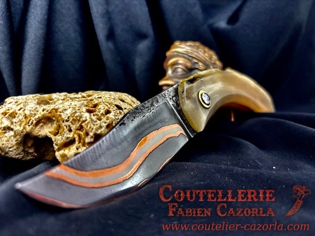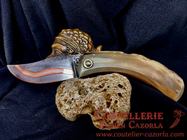 Un couteau corse pliant de fabrication traditionnelle avec une Lame de Damas Cuivre Nickel, épaisseur de 4 mm avec un manche réalisé en Corne de Bélier .