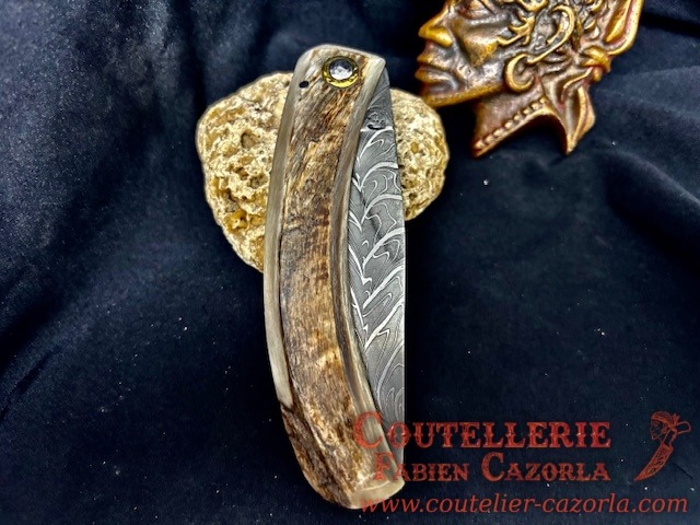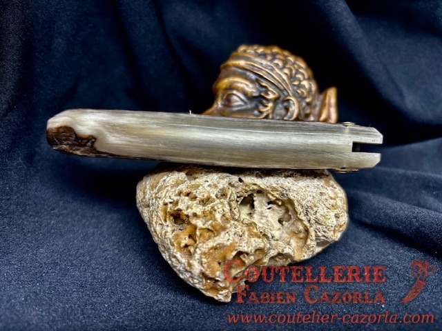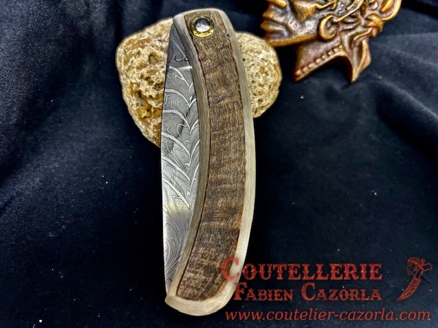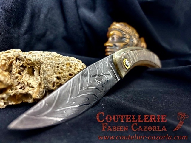 Un couteau corse pliant de fabrication traditionnelle Labellisé avec une Lame de Damas Plume épaisseur de 4 mm avec un manche réalisé en corne de bélier .