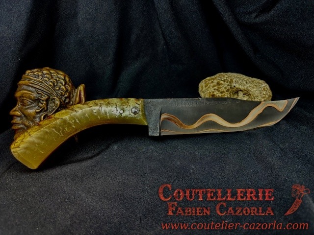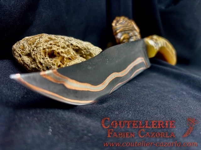 Un couteau corse fixe de fabrication traditionnelle avec une Lame de Damas Cuivre Nickel, épaisseur de 4 mm avec un manche réalisé en Corne de Bélier .