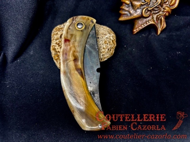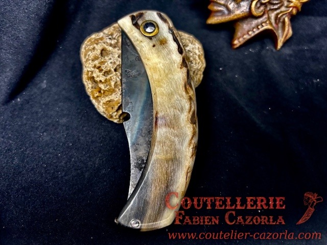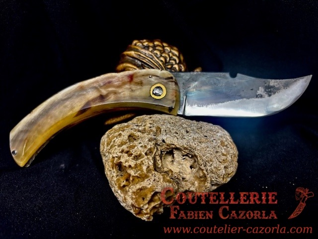 Un couteau corse pliant de fabrication traditionnelle avec un manche en Corne de Bélier et une lame en acier Carbone d’une épaisseur de 3 mm.