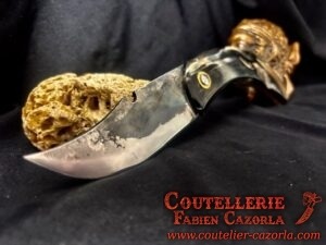 Un couteau corse pliant de fabrication traditionnelle avec un manche en Corne de Bélier et une lame en acier Carbone d’une épaisseur de 3 mm.