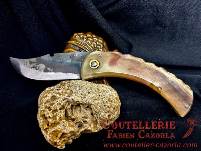 Un couteau corse pliant de fabrication traditionnelle avec un  manche en Corne de Bélier  et une lame en acier Carbone d’une épaisseur de 3 mm.