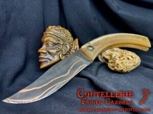 Couteau corse Labellisé traditionnelle fait-main avec un manche fabriqué en Corne de Bélier et une lame en acier Carbone d’une épaisseur de 3 mm.