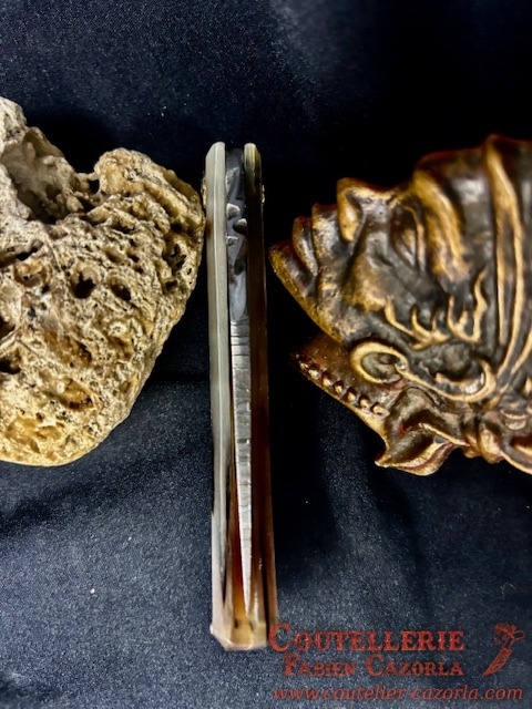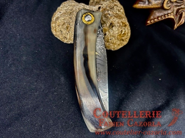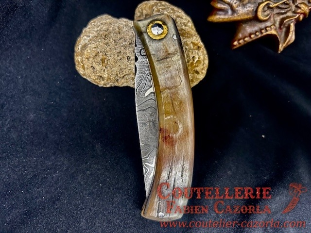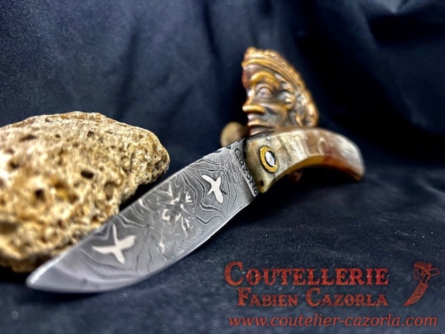Un couteau avec une Lame de Damas Mosaïque Labellisé épaisseur de 4 mm avec un manche réalisé en corne de Bélier .